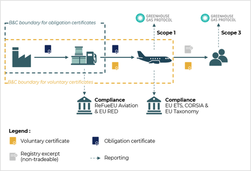 Au cœur de ce dispositif, les certificats SAFc (Sustainable Aviation Fuel certificates) constituent un levier stratégique. Chaque certificat représente les bénéfices environnementaux d'une tonne de SAF pur et peut être échangé sur un marché liquide. Ce mécanisme permet une ventilation intelligente de la valeur : l'opérateur aérien utilise le certificat pour sa conformité réglementaire (scope 1, émissions directes liées au carburant brûlé par ses avions), tandis que l'entreprise cliente peut acheter les attributs environnementaux pour décarboner ses voyages d'affaires ou son fret (scope 3, émissions indirectes liées à ses voyages d'affaires ou à son fret). Cette double valorisation crée une demande solvable massive qui n'existait pas auparavant. La crédibilité du système est assurée par des standards internationaux comme l'ISCC[14]et le RSB[15],qui garantissent la durabilité des matières premières. Si la valeur du certificat peut être partagée entre différentes entités, l’attribut environnemental ne peut toutefois être revendiqué qu’une seule fois grâce aux règles d’assignation et d’annulation.
